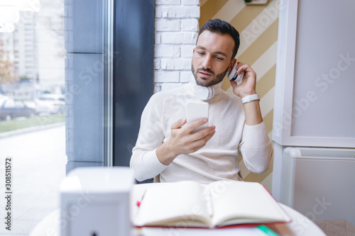 Attentive brunette male person looking at his books