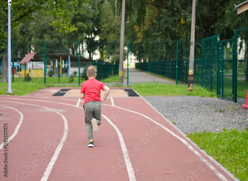 Attractive Caucasian boy runs around the stadium