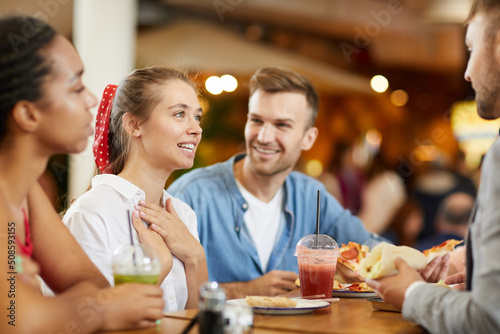Attractive girl with ribbon in hair sitting at table in cafe and pointing at herself while introducing herself to new friends