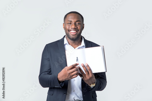 Attractive handsome happy smiling professional businessman holds an open book for entries. Afro American male.