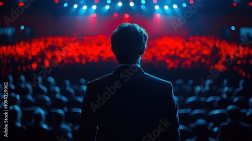 Audience captivated by speaker at a conference with vibrant blue and red lighting in a large auditorium