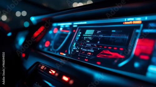 Augmented reality vehicle navigation, digital cockpit display, city lights, dark mode