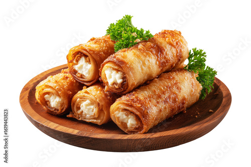 Australia Chiko Roll or crispy fried chicken wrap stuffed with melted cheese, bell peppers, and meat on wooden plate, isolated on white transparent background
