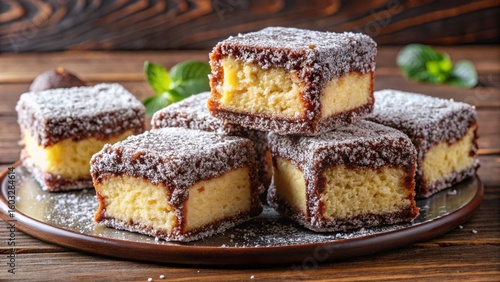 Australian Lamington (Dinner dessert) Sponge cake coated in chocolate and coconut—Australia’s nostalgic sweet dinner dessert.