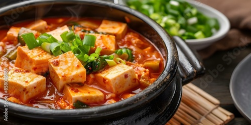 Authentic Korean Tofu Kimchi Jjigae Served in Traditional Earthenware Pot. Concept Korean Cuisine, Tofu Recipes, Kimchi Dishes, Traditional Cooking, Earthenware Pot