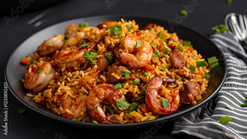 Authentic Louisiana Jambalaya on a Sleek Black Plate