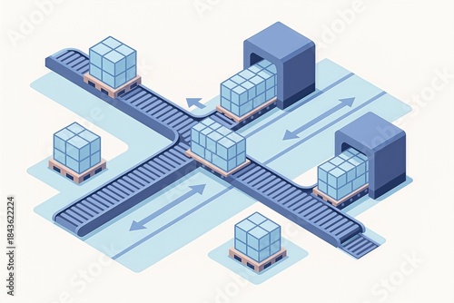 Automated logistics system with multiple conveyor belts transporting packaged goods demonstrating the efficiency of modern supply chain management strategies