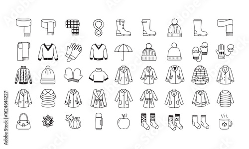 Autumn Begins style icons – seasonal outfit items, white background, line art
