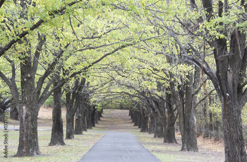 Autumn green trees against the pathway