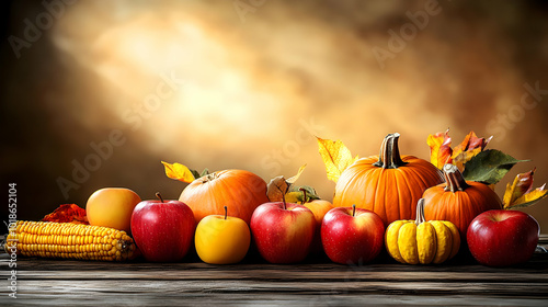 Autumn Harvest Still Life with Pumpkins, Apples, and Corn on a Wooden Table with a Blurred Background