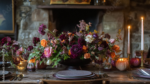 Autumn holiday tablescape and table decor, autumnal table setting with flowers and pumpkins, formal dinner event celebration party, beautiful cutlery, tableware and pumpkin decoration idea