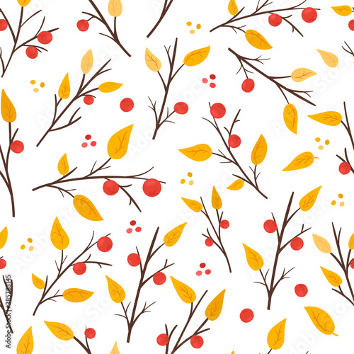 autumn seamless pattern, branches with autumn leaves and berries, yellow leaves