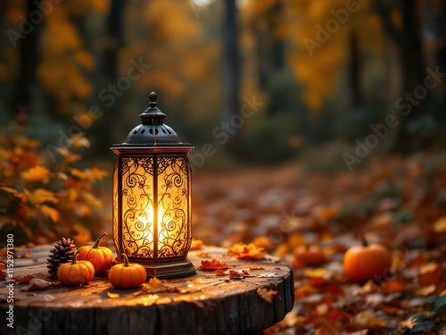 Autumn Serenity A Glowing Lantern in the Heart of the Forest