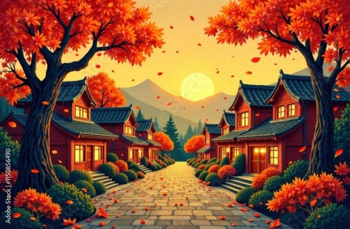 Autumn splendor, cozy city square, golden sunset, cozy houses with warmly lit windows, flying leaves, windy trees