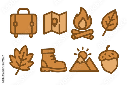 Autumn travel and adventure icon set. Minimalist vector illustrations for fall season hiking and camping. Contains suitcase, map, campfire, leaves, boot, mountain, and acorn.