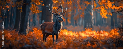 Autumnal forest with a lone deer standing amongst the colorful foliage, 4K hyperrealistic photo