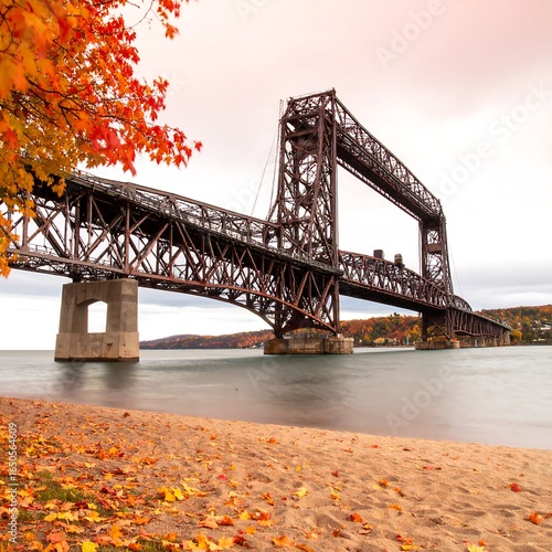 Autumnal landscape featuring a rusty, metal truss bridge spanning calm water, with a sandy shore and vibrant fall foliage in the foreground