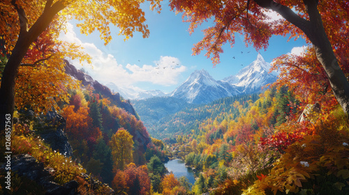 Autumnal mountain lake view, vibrant foliage, sunny sky