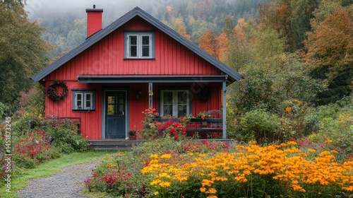 Autumnal Red Cottage in a Flower Garden, Misty Mountains in Background