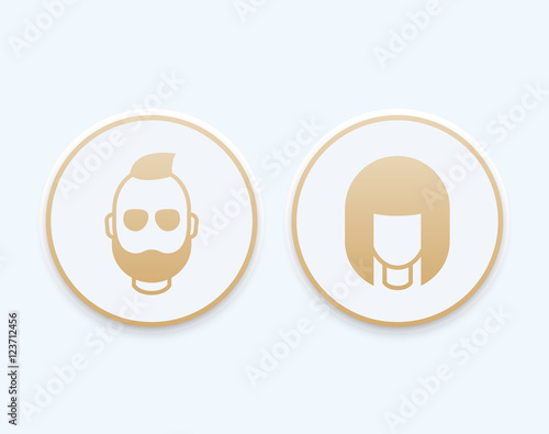 Avatars round trendy icons, girl and bearded man, gold login pictograms, vector illustration