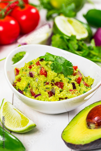Avocado Guacamole Mexican Dip with Avocado, Lime, Tomato and Cilantro. Selective focus.