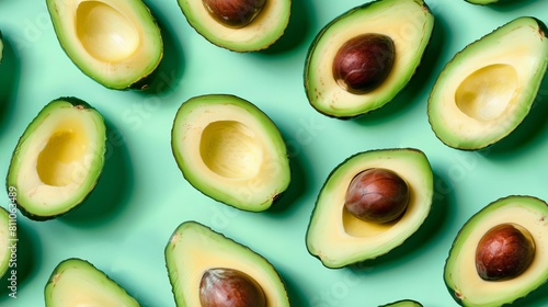 Avocado slices and whole, shot from above, making a fun pattern on a bright pastel color background, magazine cover photo