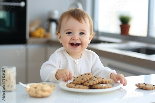 Baby sitting at table with plate of cookies, ideal for family and food concepts