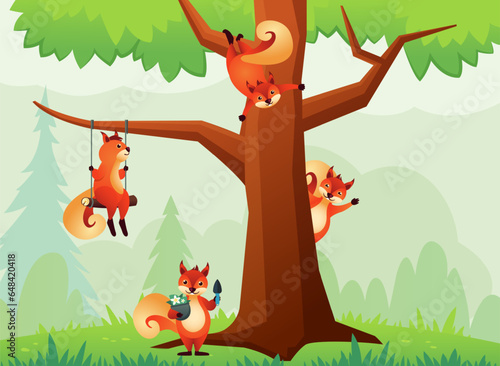 baby squirrels background. squirrels in forest on the tree, cute funny little ginger squirrels in forest nature, wildlife animals. vector cartoon animals background.