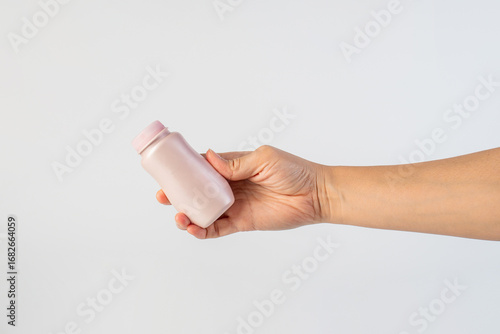 Baby talcum powder container in hand on white background