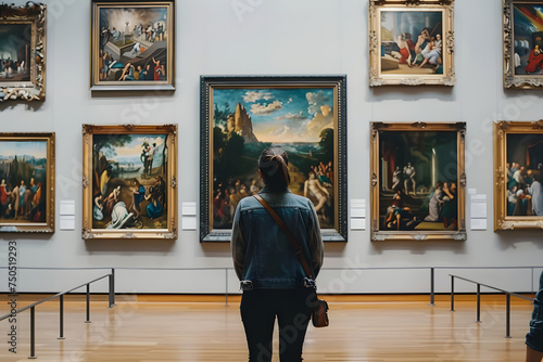Back of an adult person looking at renaissance style paintings in an old museum art gallery