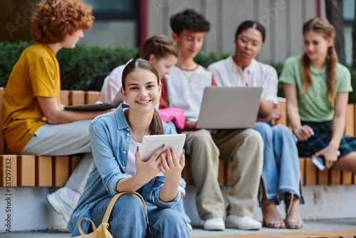 back to school, happy girl holding digital tablet, diversity, blur, teacher and students, e-learn