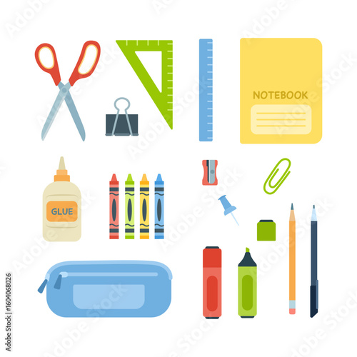 Back to school set. Stationery vector illustration set, educational inventory, objects, school supplies, ruler, notebook, pencils, pen, scissors, glue, pencil case, paper clip.