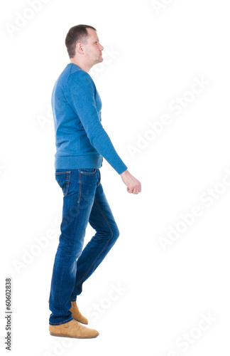 Back view of going handsome man in blue pullover.