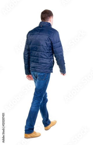 Back view of going handsome man in jeans and jacket. walking young guy . Rear view people collection. backside view of person. Isolated over white background.