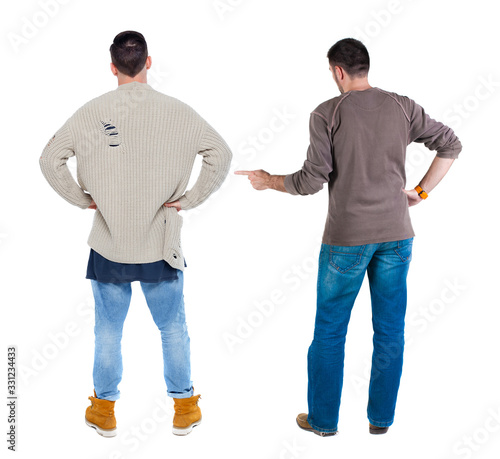 Back view of two man in sweater pointing.