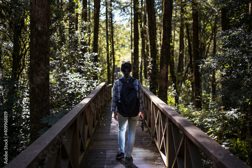 Back view of unrecognizable female tourist walking along wooden bridge in green forest during vacation in Alishan Township
