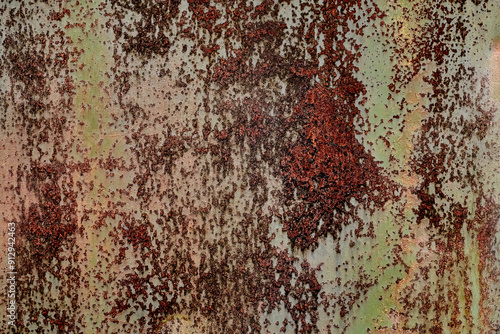 Backdrop of rusty surface of dark, brown, and orange hues. Detailed grunge rusted metal texture. Close-up of rust patterns, aged iron, scratched, worn, distressed areas, decay, corrosion details