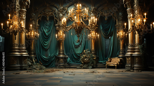 Backdrops of Fantastic Theatre Backstage Wall With Ornamental Design And Chandelier Gold Curtain Old Trunks Background