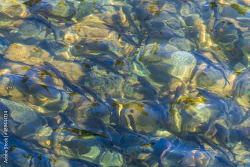 Background image of clear water with rocks below the surface in summer time. Wallpaper, calming, pristine photo.
