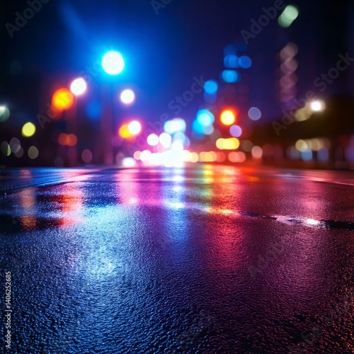 Background of wet asphalt with neon light. Blurred background, night lights, reflection.