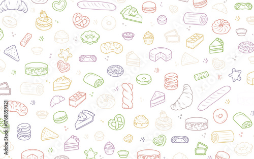 Background with colorful illustrations of baked goods and confectionery. Cakes, croissants, donuts, muffins, pretzels, cookies, sweets. Illustration for packaging sweets, cafe and pastry shop menus.