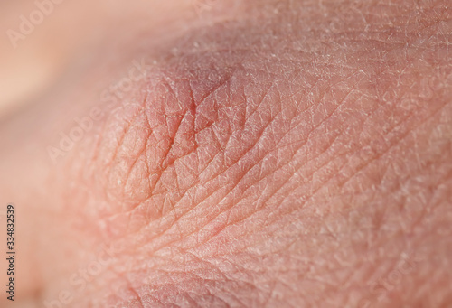 background with the texture of pink weathered human hand skin covered with deep wrinkles and dry scales and cracks
