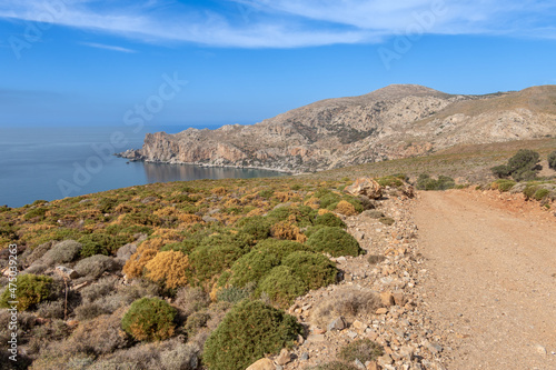 Backroads of the wild southern coast of the island of Crete, Greece. Wonderful landscapes, secluded beaches facing the lybian sea.