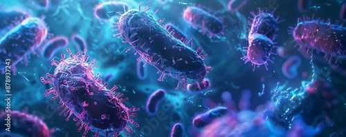 Bacteria, neon blue glow, holographic microbe study, futuristic laboratory