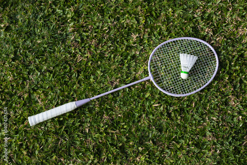 Badminton racquet and shuttlecock on green grass