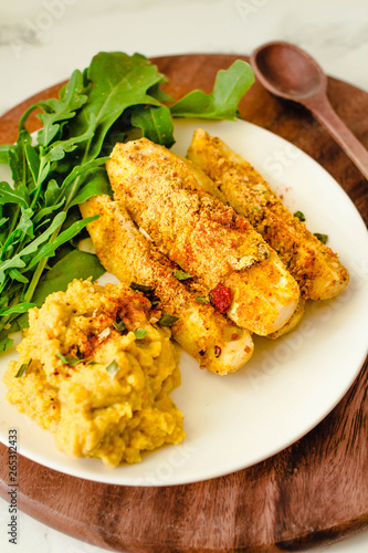 Baked Garlic Parmesan Zucchini sticks, crunchy and crispy. Served with hummus sauce.Close-up.