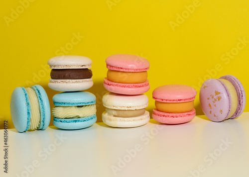 baked round macarons on a yellow background, delicious dessert