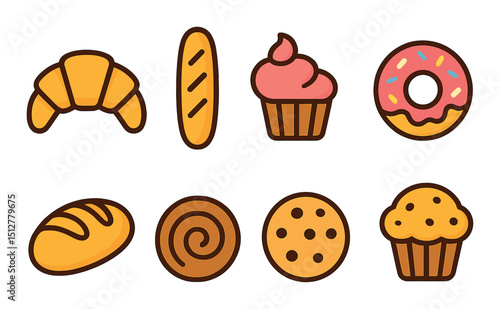 Bakery and dessert icon set in flat style. bread, pastry, and sweets symbols