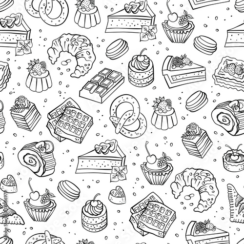 Bakery, cakes,dessert, pastries linear pattern. Hand drawn vector illustration of goodies, sweets, cakes and pastries. Design elements for confectionery and bakery shops.