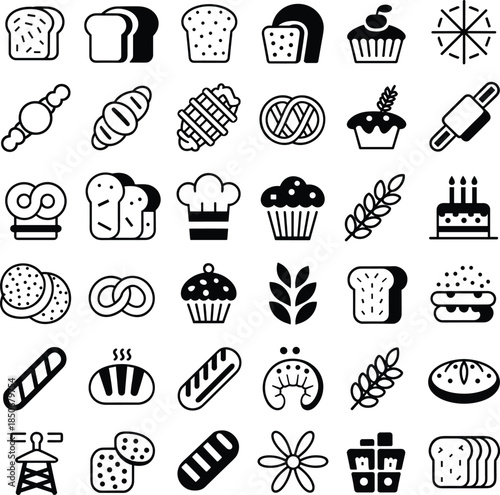 Bakery icon set, baked goods symbols, pastry bread dessert sketch, rolling pin chef hat wheat art, flat vector illustration